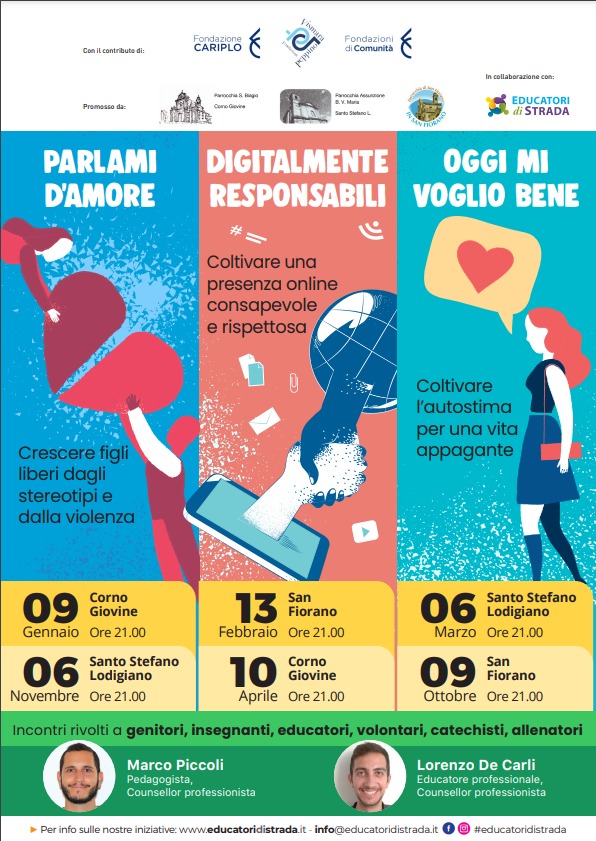 Unità Pastorale Incontri per i genitori, educatori, volontari, catechisti, allenatori… dicembre 31, 2024 parrocchiasanfloriano Serie di incontri sui temi: Parlami d’amore, Digitalmente responsabili, Oggi mi voglio bene. Condividi: Fai clic per condividere su WhatsApp (Si apre in una nuova finestra) WhatsApp Tweet Fai clic per inviare un link a un amico via e-mail (Si apre in una nuova finestra) E-mail Correlati