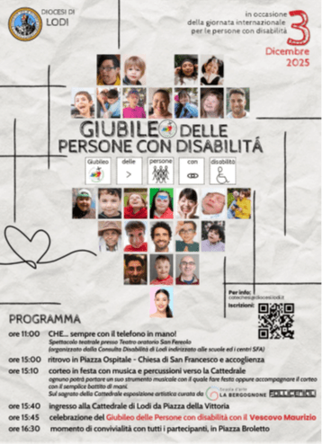 La Commissione Disabilità dell’Ufficio Catechistico Diocesano (UCD) ci invita a partecipare al Giubileo delle Persone con disabilità che si terrà il 3 Dicembre 2025 a Lodi. Questo appuntamento rappresenta un’occasione preziosa per celebrare la dignità e il protagonismo che le Persone con disabilità hanno all’interno della nostra comunità ecclesiale diocesana. Sarà un momento di incontro, preghiera, condivisione e festa, in cui potremo rafforzare il nostro impegno a costruire una Chiesa sempre più inclusiva e accogliente per tutti. L’invito è rivolto a tutte le Persone con disabilità presenti nelle Nostre parrocchie, alle loro famiglie, alle Associazioni che operano nel Vostro territorio e che si dedicano alle persone con disabilità, ai catechisti, agli operatori pastorali e a chiunque possa essere interessato.