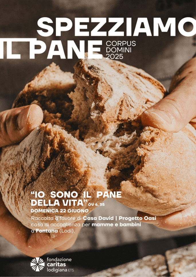 Domenica 22 giugno, solennità del Corpus Domini, torna l’iniziativa Spezziamo il Pane (giunto alla sua 23° edizione). La solennità del Corpus Domini, che celebra la presenza di Cristo nell’Eucaristia, è profondamente legata alla carità. L’Eucaristia, dono supremo dell’amore di Gesù, invita noi tutti a imitare questo amore attraverso gesti concreti di condivisione e unità. Durante l’Ultima Cena, Cristo unì l’istituzione del sacramento al comandamento di amarsi reciprocamente, facendo dell’Eucaristia un richiamo a vivere la comunione fraterna. Nella Diocesi di Lodi questa festa si è sempre accompagnata ad un’opera di carità promossa da Caritas: mentre il pane di vita nutre i cristiani per diventare a loro volta pane spezzato per gli altri, traducendo l’adorazione in carità attiva. Quest’anno l’opera che viene sostenuta è Casa David: casa di accoglienza per mamme e bambini in difficoltà all’interno del progetto Oasi, a Fontana (Lodi).